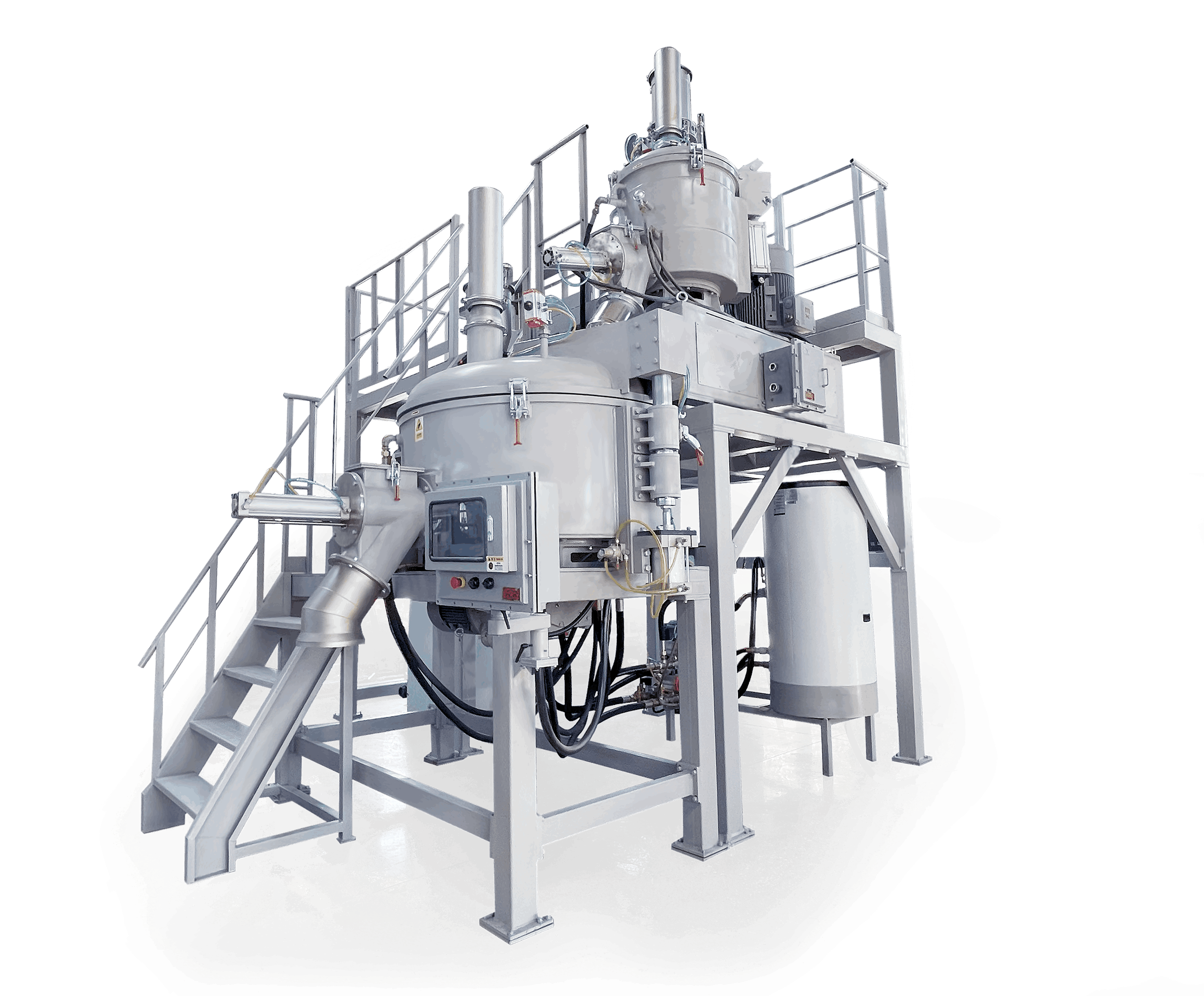 該設備混料罐采用惰性氣體吹洗,配有防爆系統和雙重密封系統,邦定罐和冷卻罐配有夾層水冷系統,罐體采用大圓弧設計,折流板的角度和高低可任意調節,自潔性好,升溫均勻。